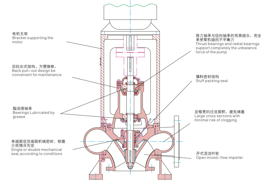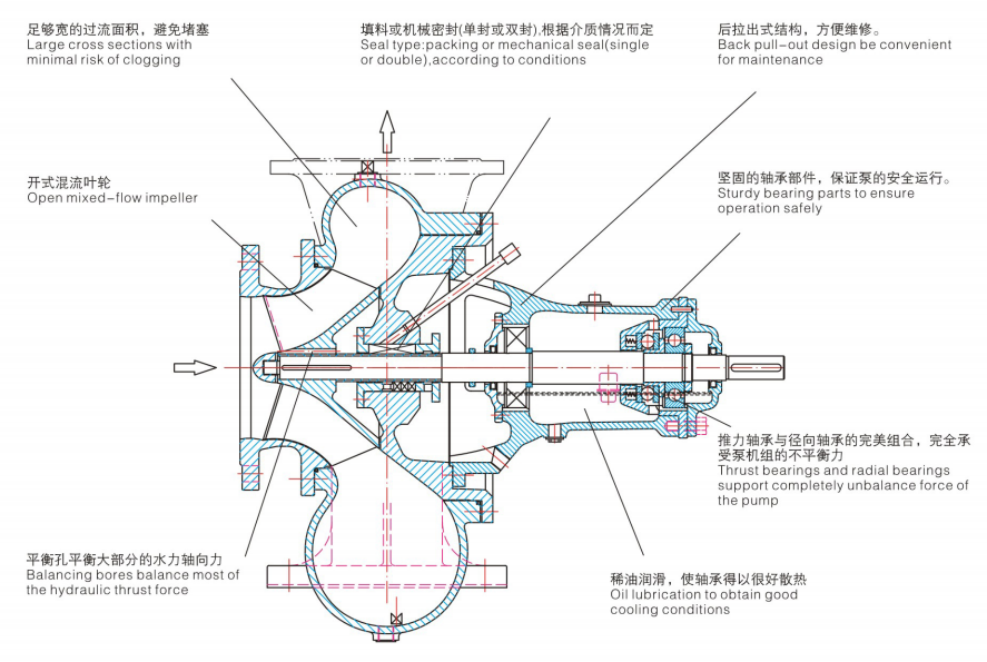MF系列泵為單級(jí),單吸,徑向剖分混流泵。泵的安裝方式為臥式或立式,底腳支承。結(jié)構(gòu)設(shè)計(jì)特點(diǎn)見(jiàn)剖面圖