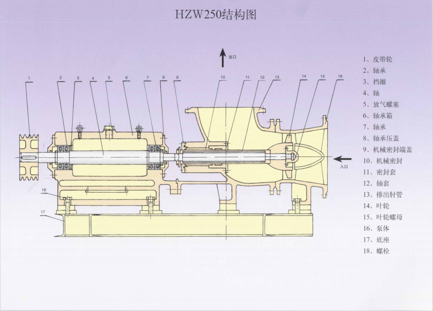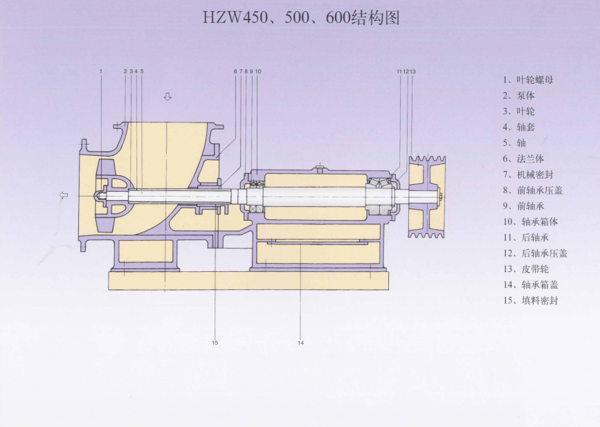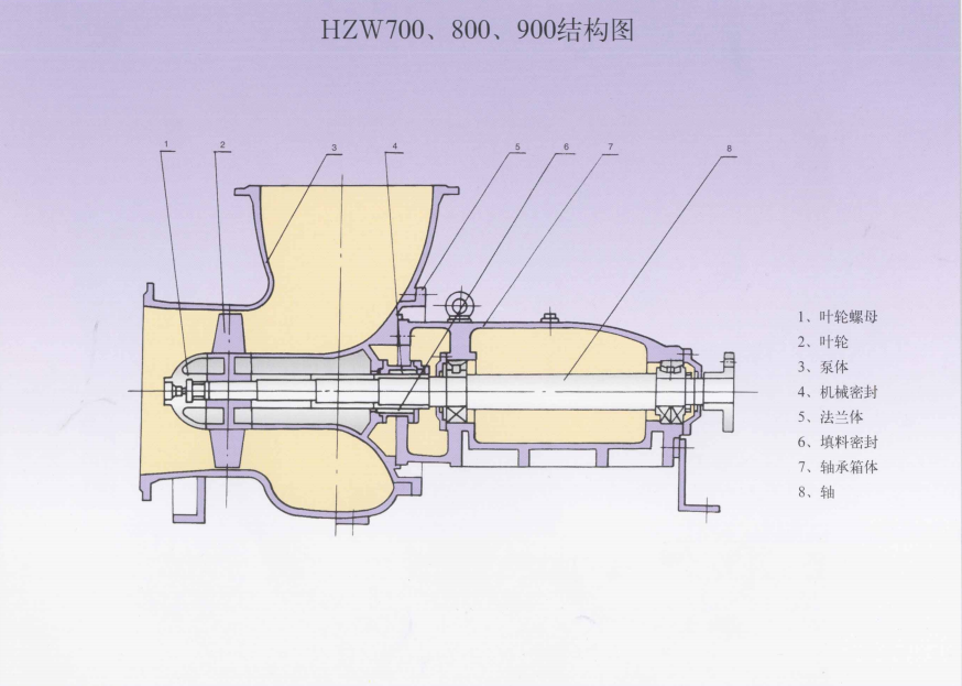 HZW系列是臥式軸流泵,采用懸臂式支撐型式,單級(jí)單吸軸流式葉輪,電機(jī)采用直聯(lián)或皮帶傳動(dòng)。采用后開門的結(jié)構(gòu),使得在檢修或更換密封時(shí),只要抽出轉(zhuǎn)動(dòng)部分即可,而不需要拆卸管路,因此具有維修方便的特點(diǎn)。密封型式可采用雙端面機(jī)械密封或填料密封。泵體采用彎管式或蝸殼式結(jié)構(gòu),泵進(jìn)出口口徑相同。軸承箱體帶有水冷腔,用以通冷卻水冷卻軸承。對(duì)于懸掛式結(jié)構(gòu)或彈性基礎(chǔ)式的軸流泵為特殊設(shè)計(jì),歡迎來電垂詢。