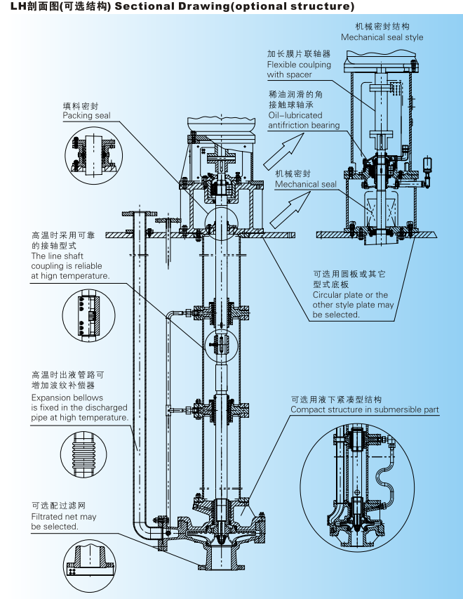 LH系列為立式、單級(jí)單吸液下泵,介質(zhì)側(cè)向排出。泵設(shè)計(jì)符合API610標(biāo)準(zhǔn),為VS4泵型。